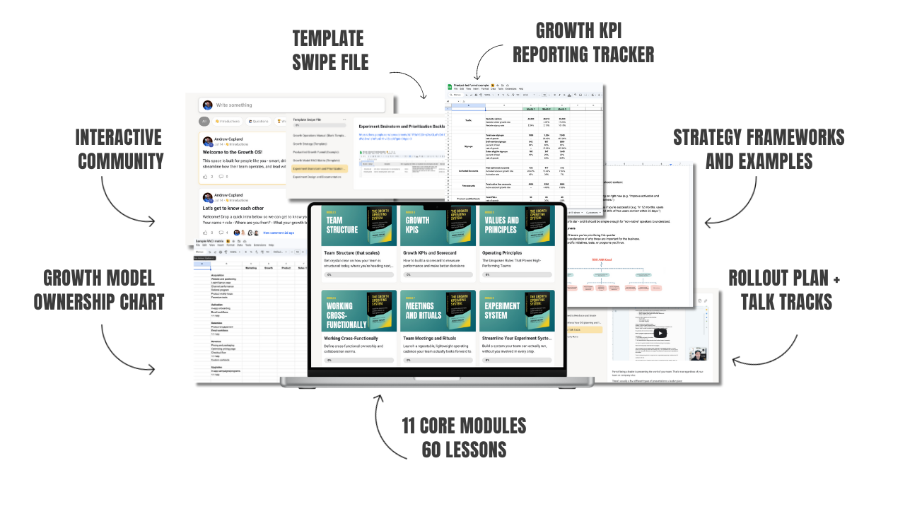 I built the Growth OS while leading growth at Wistia and Postscript, then refined it with dozens of my coaching clients. It’s a plug-and-play system that frees you from nonstop work by giving your team the rituals, templates, and workflows to execute at a world-class level - without every decision running through you.